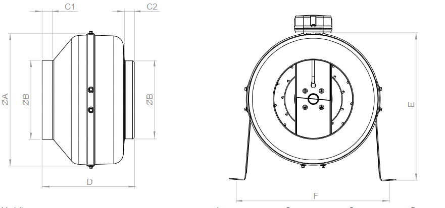 Das Gehäuse und der Lüfter sind aus hochwertigem verzinktem Blech gefertigt, das gegen Korrosion gepresst ist. Alle Modelle haben einen Außenläufermotor mit geschlossener Bauweise und Lufttransport bei max. 40ºC. Auf Wunsch kann der Motor thermisch hochtemperaturgeschützt ausgeführt werden. Der Klemmenkasten und die Befestigungsbeine werden standardmäßig mit dem Produkt geliefert. Saug- und Druckstutzen sind rohrdurchmesserkompatibel und können per Klemme angeschlossen werden.